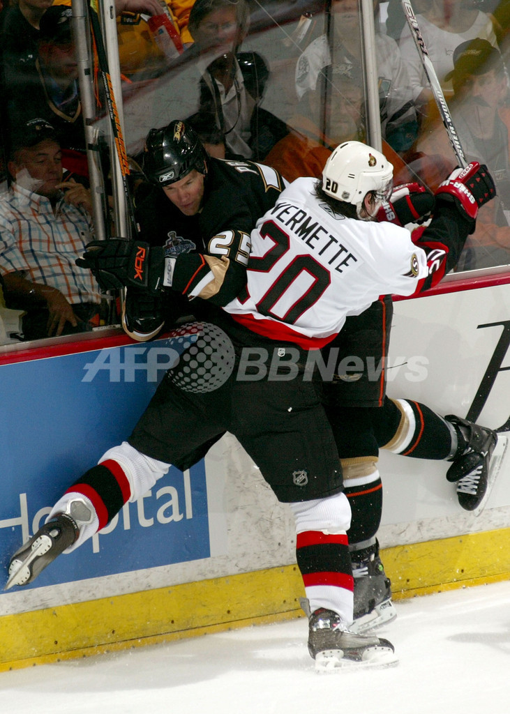 【6月7日 AFP】06-07NHL、スタンレー杯(Stanley Cup 2007)、アナハイム・ダックス(Anaheim Ducks)vsオタワ・セネターズ(Ottawa Senators)、第5戦。試合はダックスが6-2でセネターズを破り、通算成績を4勝1敗としてチーム史上初となるスタンレー杯優勝を飾った。
