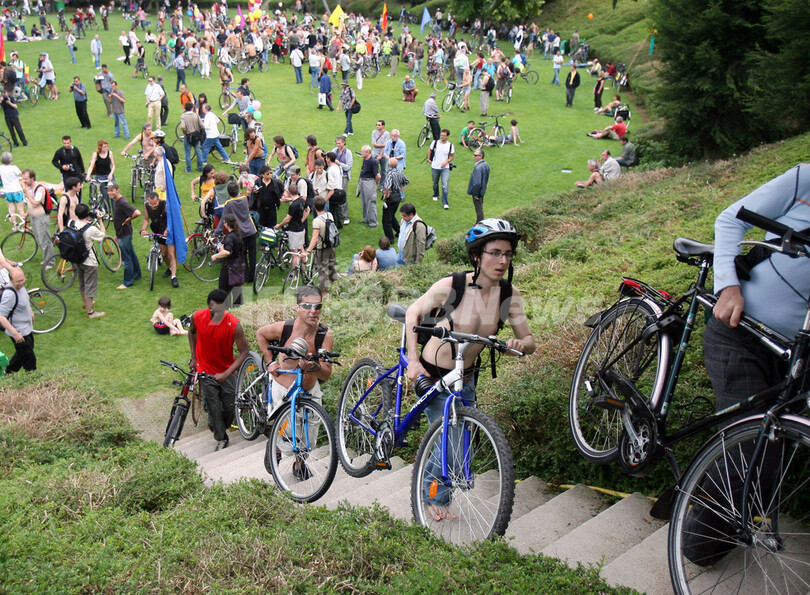 【6月10日 AFP】裸の男女が自転車に乗り、環境保護の必要性を訴える「World Naked Bike Ride」が9日、ロンドン、パリ、マドリード、モントリオール、メキシコ市など世界各都市で開催された。