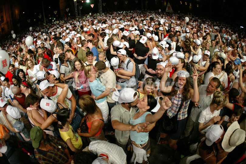 ニュース ライフ こぼれ話 1万2800人がキス大会に大集合、ギネス新記録を樹立 2007年6月10日 16:20 発信地:ブダペスト/ハンガリー [ ヨーロッパ ハンガリー ] このニュースをシェア ‹ › ❮ 1/4 ❯ 2007年6月9日、ブダペスト(%%Budapest%%)の議会前で行われたキス大会に参加する人々。(c)AFP/FERENC ISZA 画像作成中 ! 【6月10日 AFP】首都ブダペスト(Budapest)の議会前で9日、ギネスブック(Guinness Book)の世界記録をかけたキス大会が開催された。大衆紙「Bors」の呼びかけで集まった1万2800人以上が一斉にキスをし、これまで最多記録だった2007年2月10日にフィリピンのマニラ(Manila)で作られた記録を破った。(c)AFP ライフ 一覧へ> メディア・報道関係・法人の方向け 写真・動画 購入のお問合せ>