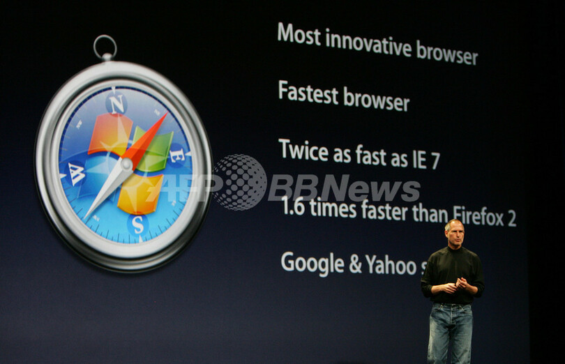 またジョブズ氏は、Windows XPVistaでも使えるアップルのSafariを発表し、マイクロソフト(Microsoft)が圧倒的なシェアを誇るウェブブラウザのInternet Explorerに対して、シェア奪回をはかると宣言した。(c)AFP