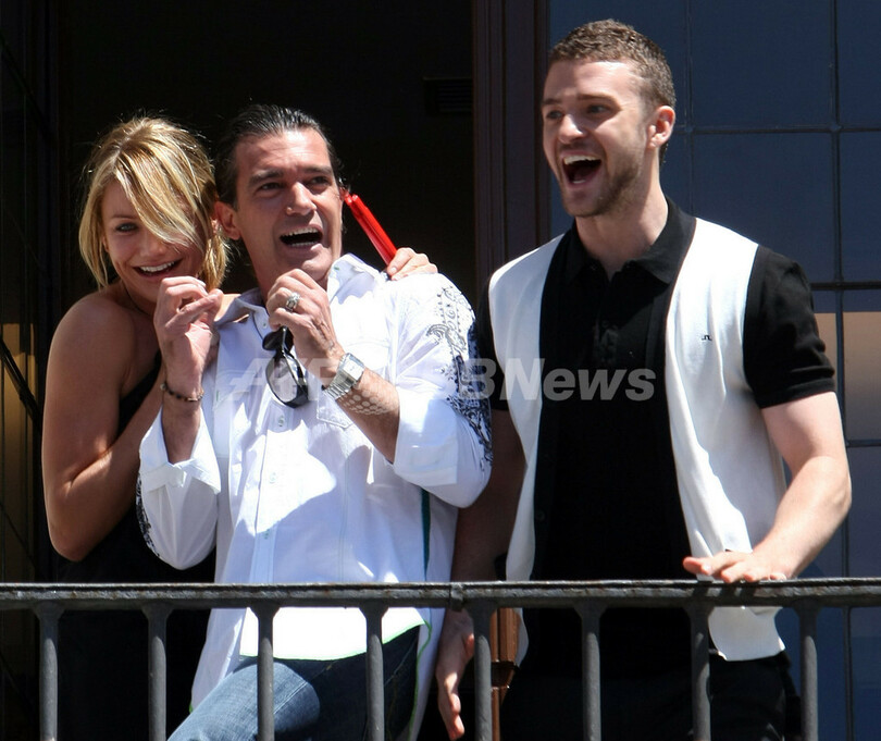 2007年6月13日、マドリードで行われた映画『シュレック3(%%Shrek The Third%%)』のフォトコールに参加する(左から)キャメロン・ディアス(%%Justin Timberlake%%)、俳優のアントニオ・バンデラス(%%Antonio Banderas%%)、歌手のジャスティン・ティンバーレイク(%%Justin Timberlake%%)。(c)AFP/PHILIPPE DESMAZES