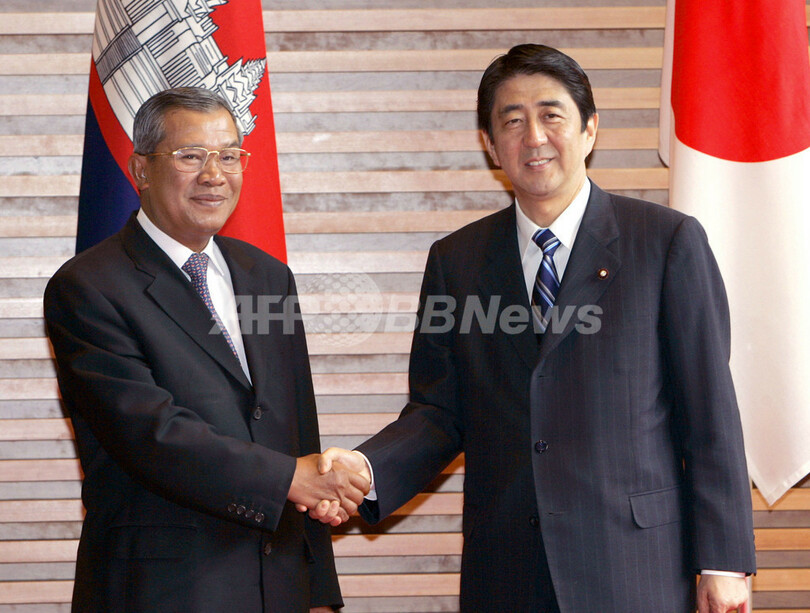 【6月14日 AFP】13日から4日間の日程で来日中のカンボジアのフン・セン(Hun Sen)首相は14日、安倍晋三首相と首脳会談を行った。