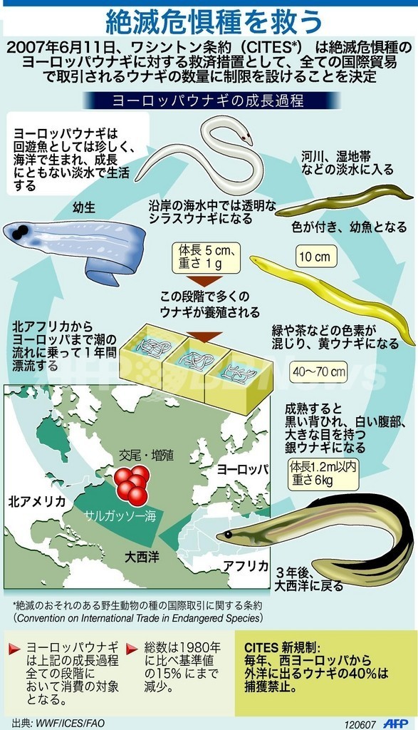 ニュース 環境・科学 図解 絶滅が危惧されるヨーロッパウナギ、捕獲制限で救済措置 2007年6月14日 18:10 発信地:ハーグ/オランダ [ ヨーロッパ オランダ ] このニュースをシェア 図は、絶滅の危機にさらされているヨーロッパウナギの成長過程を示したもの。(c)AFP 【6月14日 AFP】オランダのハーグ(Hague)で4日、ワシントン条約(絶滅のおそれのある野生動植物の種の国際取引に関する条約、CITES)常設委員会会合が開かれ、絶滅が危惧されているヨーロッパウナギの捕獲を制限する規制を設けることが決定した。(c)AFP<ニュース解説画像一覧へ> 環境・科学 一覧へ> メディア・報道関係・法人の方向け 写真・動画 購入のお問合せ>