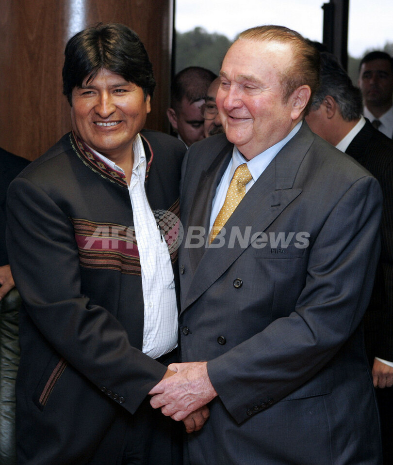 【6月16日 AFP】南米サッカー連盟(コンメボル:CONMEBOL)の医療委員会の会合にボリビアのエボ・モラレス(Evo Morales)大統領や、南米サッカー連盟のニコラス・レオス(Nicolas Leoz)会長らが訪れた。委員会は、モラレス大統領が先導している国際サッカー連盟(FIFA)の定めた標高2500メートル以上での試合を禁止する規則の撤回要請を全会一致で決定している。(c)AFP/NORBERTO DUARTE