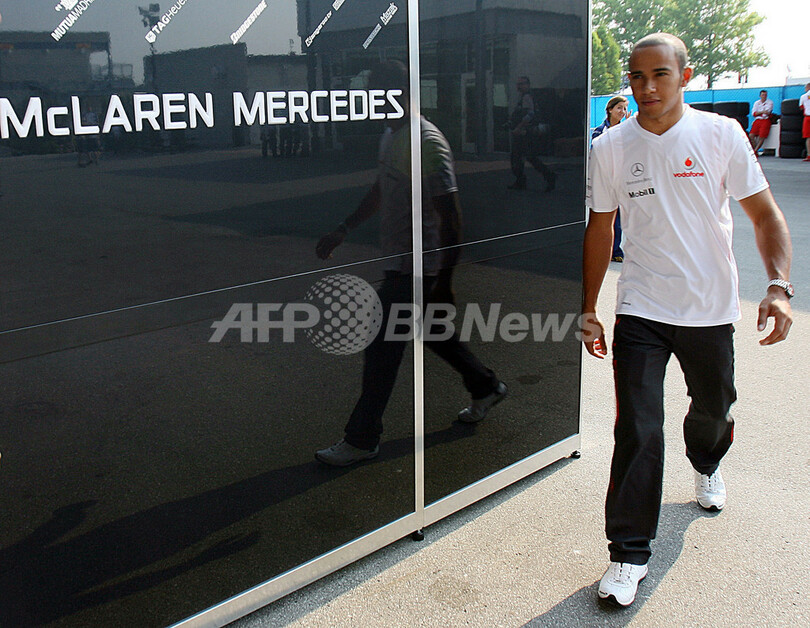 【6月17日 AFP】F1第7戦・米国GP(United States Grand Prix 2007)、決勝。予選でポールポジションを獲得し、2戦連続のポール・トゥ・ウィンでキャリア2勝目を目指すマクラーレン・メルセデス(McLaren-Mercedes)のルイス・ハミルトン(Lewis Hamilton)が、レース開始を控えインディアナポリス・モーター・スピードウェイ(Indianapolis Motor Speedway)に到着した。(c)AFP