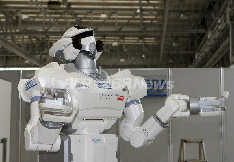 この人間型ロボット「HRP-3 Promet Mk-II(プロメテマークツー)」は、報道陣が見守る中、砂をまいて滑りやすくした床の上を歩いたり、シャワーの下で両腕を広げて見せるなどした。右手で電動インパクトレンチを使う実技も披露したが、作業中は人間と同様に左腕の上に身を乗り出してバランスをとった。
