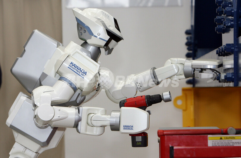 この人間型ロボット「HRP-3 Promet Mk-II(プロメテマークツー)」は、報道陣が見守る中、砂をまいて滑りやすくした床の上を歩いたり、シャワーの下で両腕を広げて見せるなどした。右手で電動インパクトレンチを使う実技も披露したが、作業中は人間と同様に左腕の上に身を乗り出してバランスをとった。