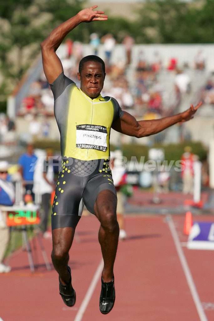 【6月23日 AFP】陸上・AT&T米国選手権(AT&T USA Outdoor Track and Field Championships)、男子走り幅跳び・決勝。ドワイト・フィリップス(Dwight Phillips)は、8メートル36を記録して優勝を果たし、8月25日に開幕する第11回世界陸上大阪大会(11th IAAF World Championships in Athletics Osaka)の出場権を獲得した。(c)AFP/Getty Images