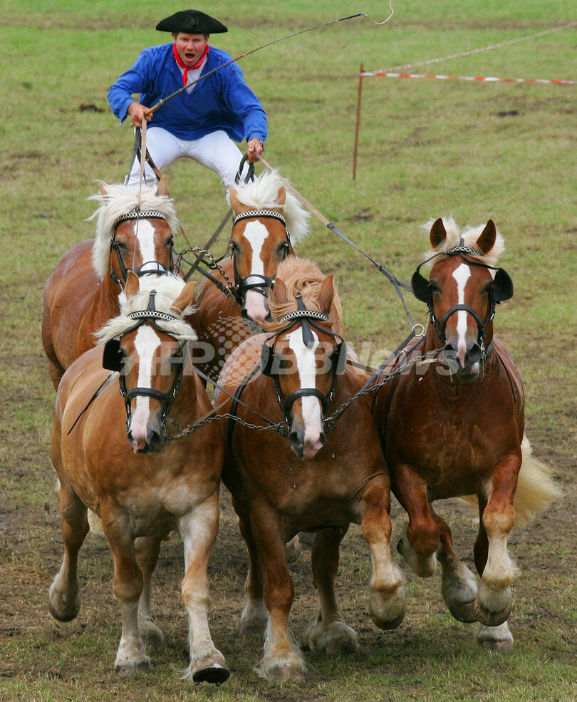 ニュース ライフ こぼれ話 タフな馬術コンテスト、ドイツで開催 2007年6月25日 16:04 発信地:Brueck/ドイツ [ ヨーロッパ ドイツ ] このニュースをシェア ‹ › ❮ 1/3 ❯ 2007年6月24日、ドイツ東部Brueckで開催された過酷な馬の競技大会「Titans of the Turf」で、5頭の馬Campino、Alino、Carlos、Neptun、Alieと、「Hungarian Post」と呼ばれる演技を披露するHubert Dechertさん。(c)AFP/DDP Michael Urban 画像作成中 ! 【6月25日 AFP】ドイツ東部Brueckで24日、過酷なパフォーマンスを披露する馬の競技大会「Titans of the Turf」が開催された。参加者は、くらを付けないレースや、一人乗り二輪馬車レースなど、さまざまな競技に参加した。(c)AFP/DDP Michael Urban ライフ 一覧へ> メディア・報道関係・法人の方向け 写真・動画 購入のお問合せ>
