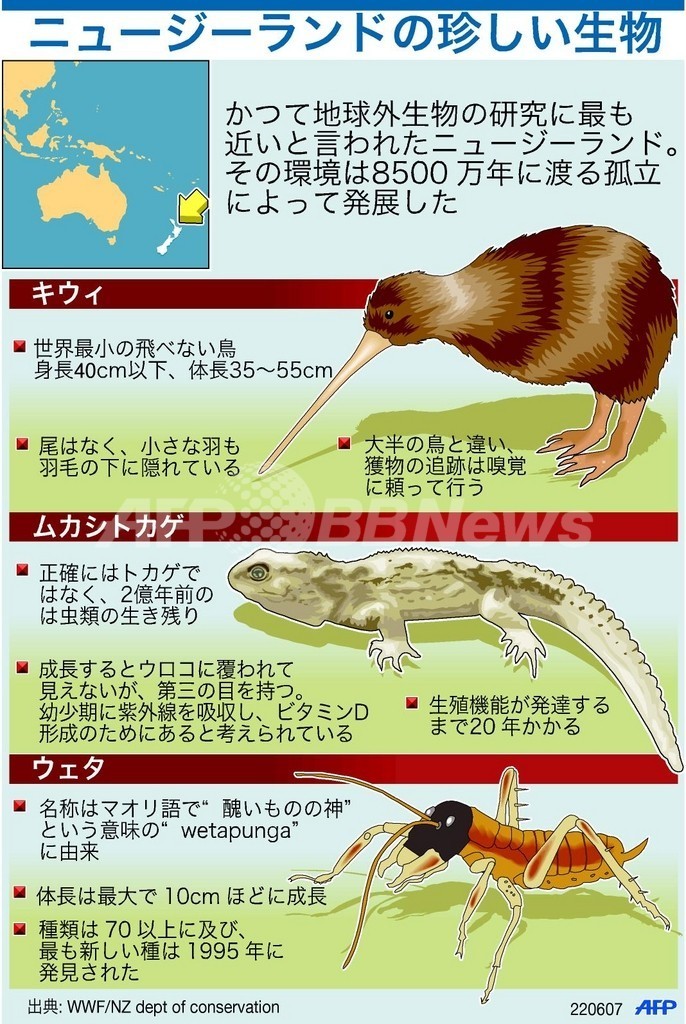 ニュース 環境・科学 図解 珍しい生き物の宝庫、ニュージーランド 2007年6月26日 23:08 発信地:ウェリントン/ニュージーランド [ アジア・オセアニア ニュージーランド ] このニュースをシェア ニュージーランド特有の珍しい生き物、キウィ、ムシトカゲ、ウェタについて示したもの。(c)AFP 【6月26日 AFP】ニュージーランドは世界最小の飛べない鳥「キウィ」など珍しい生き物が多く見られる国。(c)AFP<ニュース解説画像一覧へ> 環境・科学 一覧へ> メディア・報道関係・法人の方向け 写真・動画 購入のお問合せ>