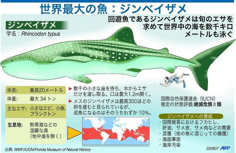 ニュース 環境・科学 図解 世界最大の魚、ジンベイザメ 2007年6月26日 23:04 発信地:マニラ/フィリピン [ アジア・オセアニア フィリピン ] このニュースをシェア 世界最大の魚、ジンベイザメについて示したもの。(c)AFP 【6月26日 AFP】世界最大の魚、ジンベイザメは、エサを求めて世界中の海を数千メートルもを泳ぐ。(c)AFP<ニュース解説画像一覧へ> 環境・科学 一覧へ> メディア・報道関係・法人の方向け 写真・動画 購入のお問合せ>