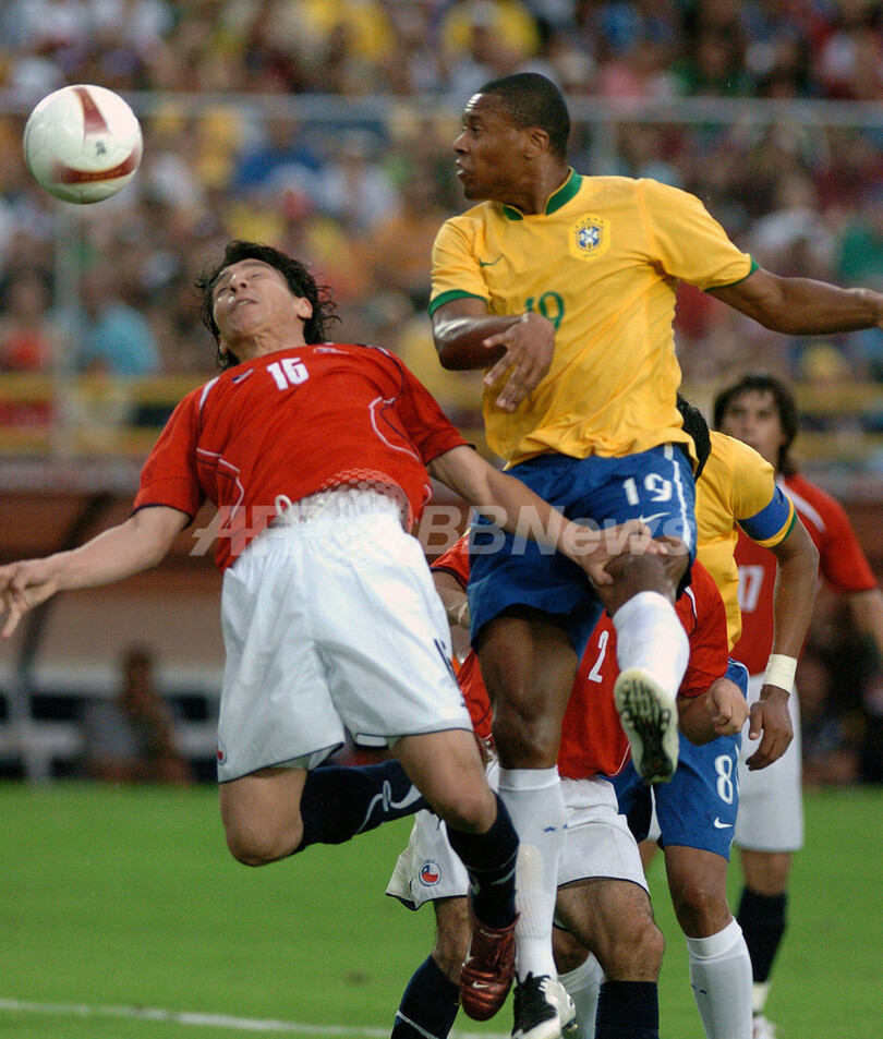 【7月2日 AFP】サッカー、コパ・アメリカ2007(Copa America 2007)・グループB、ブラジルvsチリ。試合はブラジルがレアル・マドリード(Real Madrid)のロビーニョ(Robinho)がハットトリックを達成し3-0でチリを下し、通算成績を1勝1敗とした。ブラジルは、前半36分にロビーニョ(Robinho)がPKを決めて先制し、前世界王者として後半は緊迫したが試合残り6分で、再びロビーニョが2ゴール(後半39分、42分)をもぎ取った。(c)AFP