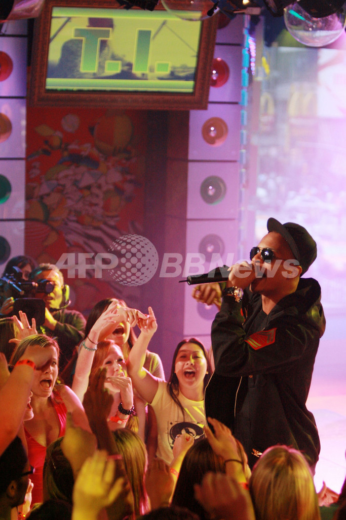 2007年7月2日、MTVの音楽情報番組「Total Request Live」に出演しパフォーマンスを披露するラッパーのT.I.。(c)AFP/Getty Images Evan Agostini