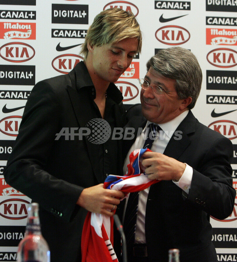 【7月4日 AFP】スペイン・リーガエスパニョーラ1部のアトレティコ・マドリード(Atletico de Madrid)からイングランド・プレミアリーグのリバプール(Liverpool)に移籍金2650万ポンド(約65億円)で移籍するスペイン代表のFWフェルナンド・トーレス(Fernando Torres)は、移籍について語るためマドリードのビセンテ・カルデロン・スタジアム(Vicente Calderon Stadium)で記者会見に臨んだ。(c)AFP