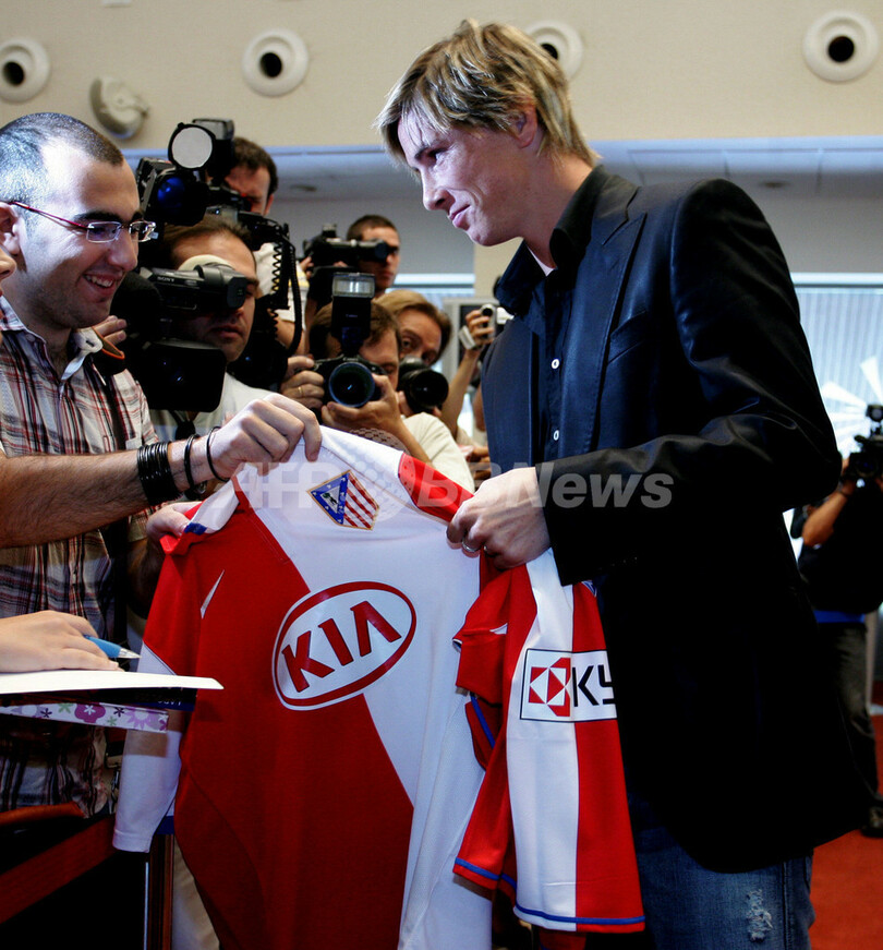 【7月4日 AFP】スペイン・リーガエスパニョーラ1部のアトレティコ・マドリード(Atletico de Madrid)からイングランド・プレミアリーグのリバプール(Liverpool)に移籍金2650万ポンド(約65億円)で移籍するスペイン代表のFWフェルナンド・トーレス(Fernando Torres)は、移籍について語るためマドリードのビセンテ・カルデロン・スタジアム(Vicente Calderon Stadium)で記者会見に臨んだ。(c)AFP