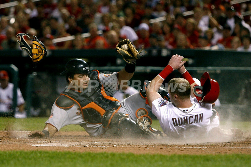 ホームに突っ込んだカージナルスのクリス・ダンカン(%%Chris Duncan%%、右)をブロックし、タッチアウトに仕留めるジャイアンツのギジェルモ・ロドリゲス(%%Guillermo Rodriguez%%)。(c)AFP/Getty Images Dilip Vishwanat