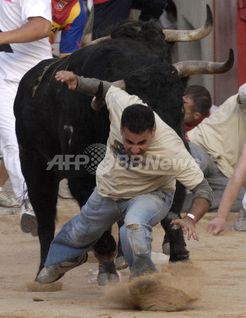 ニュース ライフ こぼれ話 3日目を迎えたスペイン牛追い祭り 2007年7月10日 16:40 発信地:パンプローナ/スペイン [ ヨーロッパ スペイン ] このニュースをシェア ‹ › ❮ 1/37 ❯ 2007年7月9日、パンプロナ(Pamplona)のサン・フェルミン(San Fermin)祭で牛から逃げまどう参加者。(c)AFP/Pedro ARMESTRE 画像作成中 ! 【7月10日 AFP】スペイン北東部の町パンプロナ(Pamplona)のサン・フェルミン(San Fermin)祭は9日、3日目を迎え、多数の住民が牛追いに参加する一方、闘牛も繰り広げられた。(c)AFP ライフ 一覧へ> メディア・報道関係・法人の方向け 写真・動画 購入のお問合せ>