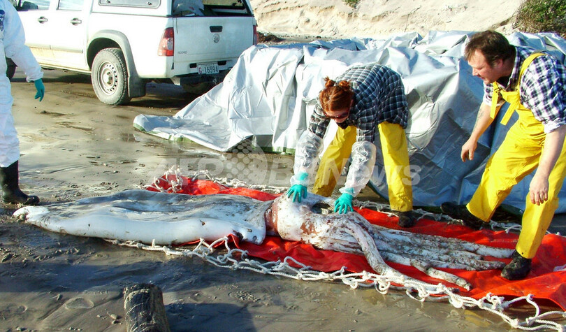 体長8メートル、胴体部分の外套膜(がいとうまく)が直径約1メートルというこの巨大イカは、同州西部ストローン(Strahan)近郊の海岸で10日に見つかった。ダイオウイカ(Architeuthis Dux)という世界最大級の無脊椎(むせきつい)動物で、水深約1キロの深海に生息しているため、生態はほとんど知られていない。同博物館で保存・展示する可能性があるという。
