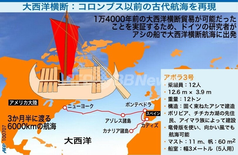 ニュース ライフ 図解 こぼれ話 1万4000年前の航海を再現、アシの船で大西洋横断へ 2007年7月11日 23:42 発信地:ワシントン/米国 [ 北米 米国 ] このニュースをシェア (c)AFP 【7月11日 AFP】アシ造りの船で大西洋横断を目指す航海の予定図。石器時代にアメリカ大陸と欧州の間で貿易があったという説を証明するため、ドイツ人研究者らがアメリカ大陸から欧州への航海に乗り出す。(c)AFP≫関連記事:大西洋横断めざすアシ舟・アボラ3号<ニュース解説画像一覧へ> ライフ 一覧へ> メディア・報道関係・法人の方向け 写真・動画 購入のお問合せ>