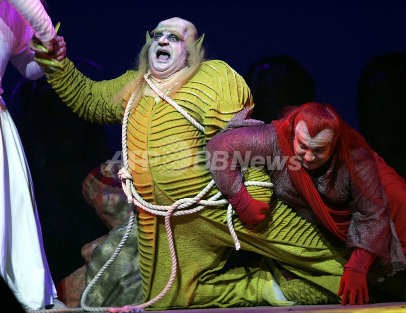 2007年7月12日、芸術祭「リンカーン・センター・フェスティバル(Lincoln Center Festival)」で行われる楽劇『ニーベルングの指環(Der Ring des Nibelungen)』四部作の「序夜」に当たる『ラインの黄金(%%Das Rheingold%%)』のリハーサルに臨むローゲ(%%Loge%%)役の%%Vasily Gorshkov%%とアルベリヒ(%%Alberich%%)役のニコライ・プティリン(%%Nikolai Putilin%%、左)。(c)AFP/TIMOTHY A. CLARY