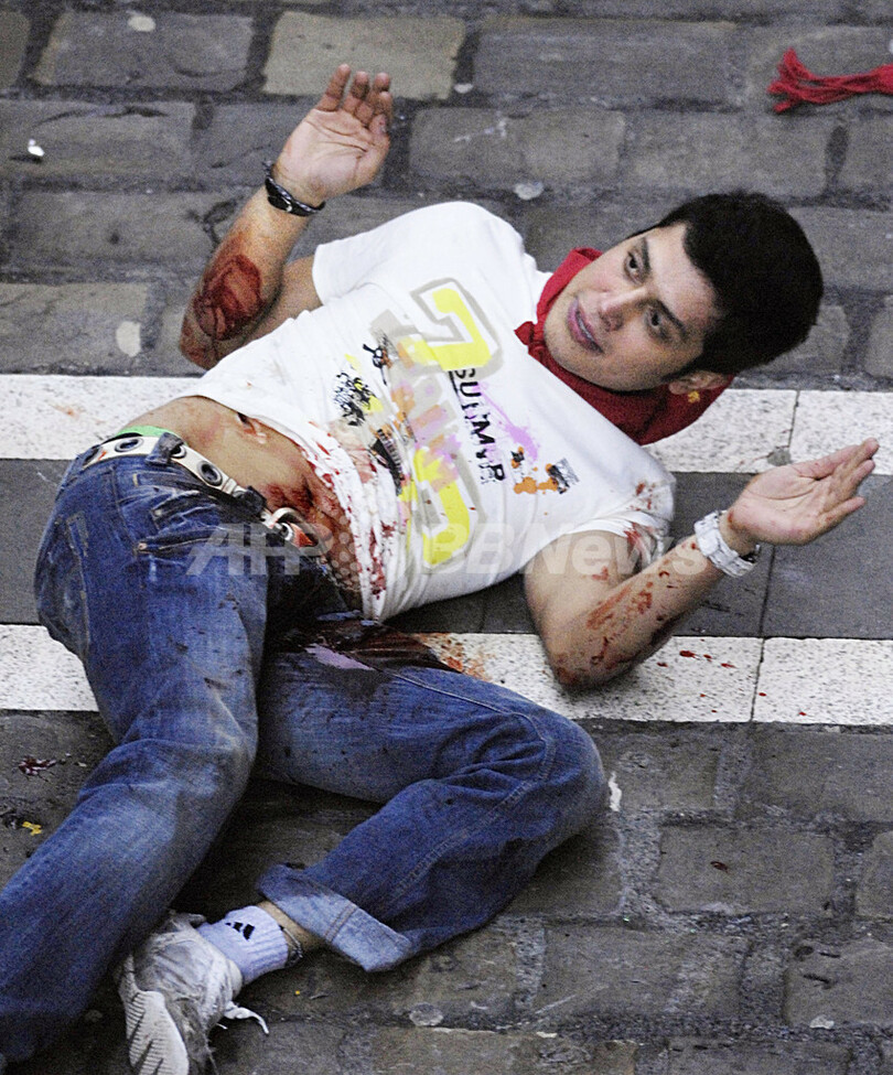 ニュース ライフ スペインの牛追い祭りで負傷者 2007年7月13日 16:17 発信地:パンプローナ/スペイン [ ヨーロッパ スペイン ] このニュースをシェア ‹ › ❮ 2/7 ❯ 2007年7月12日、パンプロナ(Pamplona)で負傷して流血する牛追い参加者。(c)AFP/A. ARRIZURIETA 画像作成中 ! 【7月13日 AFP】スペイン北東部の町パンプロナ(Pamplona)のサン・フェルミン(San Fermin)祭は12日、6日目を迎え、牛追いの住民に負傷者が出た。朝、放たれて町の小路を闘牛場に向かう牛の前を肝試しの住民が走る。その後、牛は闘牛に出る。(c)AFP ライフ 一覧へ> メディア・報道関係・法人の方向け 写真・動画 購入のお問合せ>