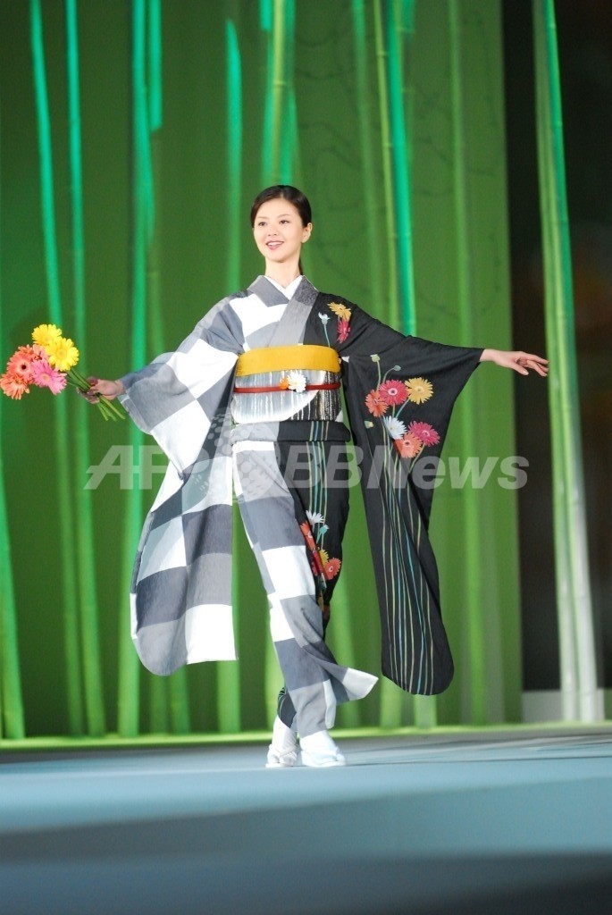 着物ショーのステージでは、女優の堀北真希(Maki Horikita)が浅井麻衣子作の白地に鮮やかな花を描いた可憐な振り袖姿を披露。また、昨年度準ミス・ユニバースの知花くらら(Kurara Chibana)も登場し、フェンディのゴージャスな白のファーコートやベージュのドレスをまとい堂々とキャットウォークをみせた。
