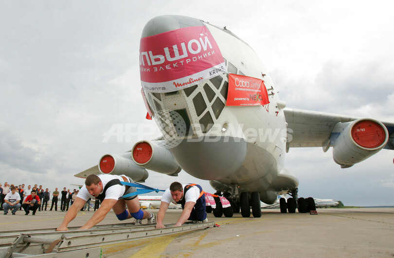 ニュース ライフ こぼれ話 人力で飛行機を引っ張る 2007年7月14日 2:01 発信地:ミンスク/ベラルーシ [ ロシア・CIS ベラルーシ ] このニュースをシェア ‹ › ❮ 2/2 ❯ 2007年7月13日、ミンスク(Minsk)の空港で、貨物用飛行機Ilyushin-76を引っ張るベラルーシのスポーツ選手、Kiril Shimkoさん(左)とPavel Sorokaさん。(c)AFP/VIKTOR DRACHEV 画像作成中 ! 【7月14日 AFP】ミンスク(Minsk)の空港で13日、150トンもの重量の貨物飛行機が人力で引っ張られた。貨物機を引っ張ったのはミンスク在住の2人のスポーツ選手。貨物機は約3メートルほど引っ張られたという。(c)AFP ライフ 一覧へ> メディア・報道関係・法人の方向け 写真・動画 購入のお問合せ>