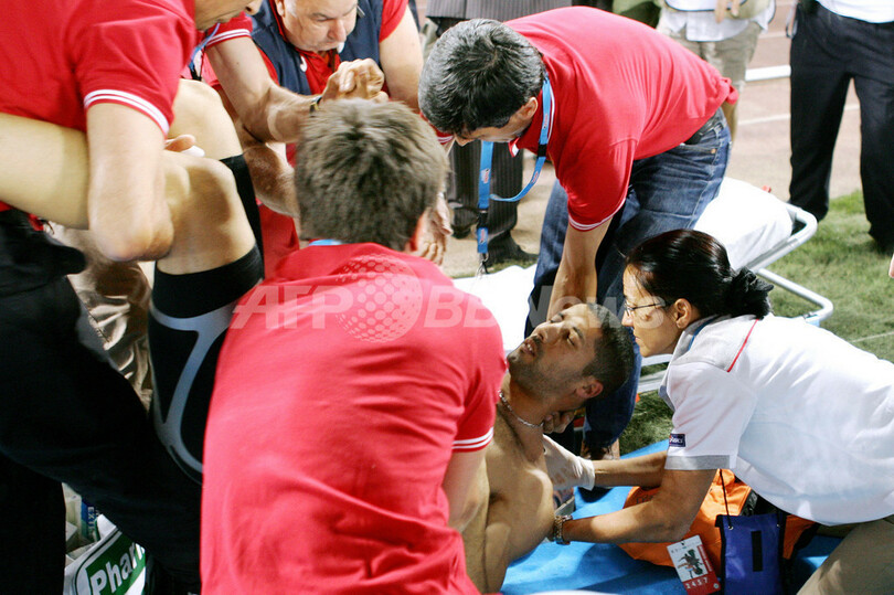 【7月14日 AFP】陸上競技、ゴールデン・リーグ2007(IAAF Golden League 2007)・第3戦、ゴールデンガラ(Golden Gala)。男子走り幅跳びに出場したフランスのサリム・スディリ(Salim Sdiri)に、男子槍投げに出場していたフィンランドのテロ・ピトカマキ(Tero Pitkamaki)が投てきした槍が刺さるという事故が起きた。