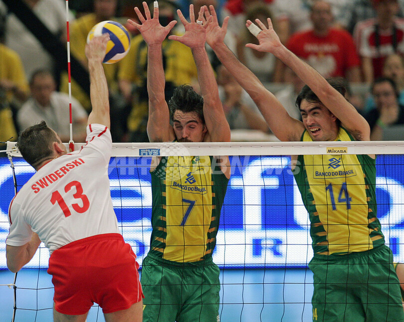 スポーツ スポーツ その他 ブラジル ポーランドを降し大会5連覇にあと1勝 2007年7月15日 6:27 発信地:カトヴィツェ/ポーランド [ ヨーロッパ ポーランド ] このニュースをシェア ‹ › ❮ 4/6 ❯ ポーランドのセバスチャン・シフィデルスキ(%%Sebastian Swiderski%%、左)のスパイクをブロックするブラジルのジバ(%%Giba%%、中央)とロドリゴ・サンタナ(%%Rodrigo Santana%%)。(c)AFP/JANEK SKARZYNSKI 画像作成中 ! 【7月15日 AFP】バレーボール、ワールドリーグ2007(FIVB World League 2007)・準決勝、ブラジルvsポーランド。試合はブラジルがセットカウント3-1(25-23、23-25、25-21、25-23)で勝利して決勝進出を決め、大会5連覇にあと1勝に迫った。(c)AFP スポーツ その他 一覧へ> メディア・報道関係・法人の方向け 写真・動画 購入のお問合せ>