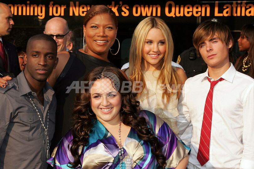 2007年7月17日、ニュージャージーで開催された映画『ヘスプレー(Hairspray)』のプレミア上映会に登場した、出演者の(左から)イライジャ・ケリー(%%Elijah Kelley%%)、クィーン・ラティファ(%%Queen Latifah%%)、ニッキー・ブロンスキー(%%Nikki Blonsky%%)、アマンダ・バインズ(%%Amanda Bynes%%)、ザック・エフロン(%%Zac Efron%%)。(c)AFP/Getty Images Bryan Bedder