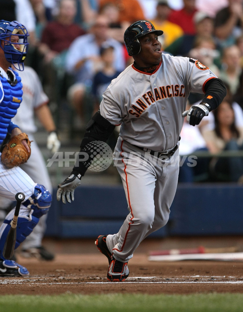 【7月21日 AFP】07MLB、ミルウォーキー・ブルワーズ(Milwaukee Brewers)vsサンフランシスコ・ジャイアンツ(San Francisco Giants)。歴代最多本塁打記録755本まで残り2本に迫っているジャイアンツのバリー・ボンズ(Barry Bonds)は、4番・左翼で先発出場するも4打数無安打に終わり、記録達成は次戦以降へ持ち越された。試合はジャイアンツが8-4で勝利を収めた。(c)AFP/Getty Images