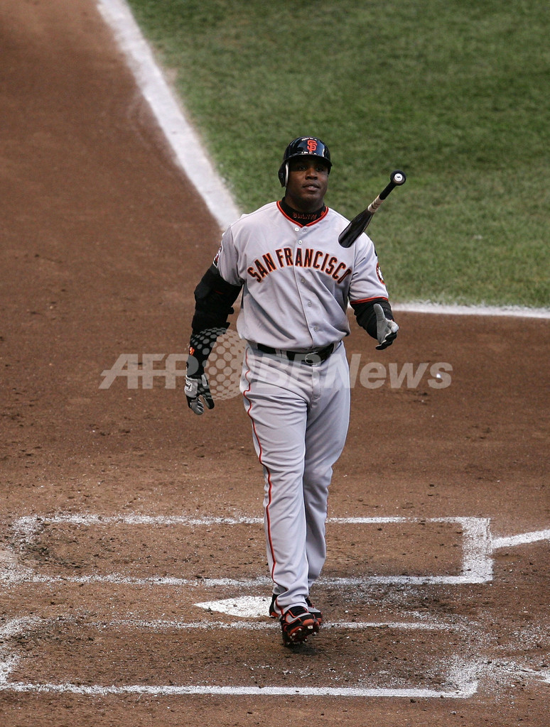 【7月21日 AFP】07MLB、ミルウォーキー・ブルワーズ(Milwaukee Brewers)vsサンフランシスコ・ジャイアンツ(San Francisco Giants)。歴代最多本塁打記録755本まで残り2本に迫っているジャイアンツのバリー・ボンズ(Barry Bonds)は、4番・左翼で先発出場するも4打数無安打に終わり、記録達成は次戦以降へ持ち越された。試合はジャイアンツが8-4で勝利を収めた。(c)AFP/Getty Images