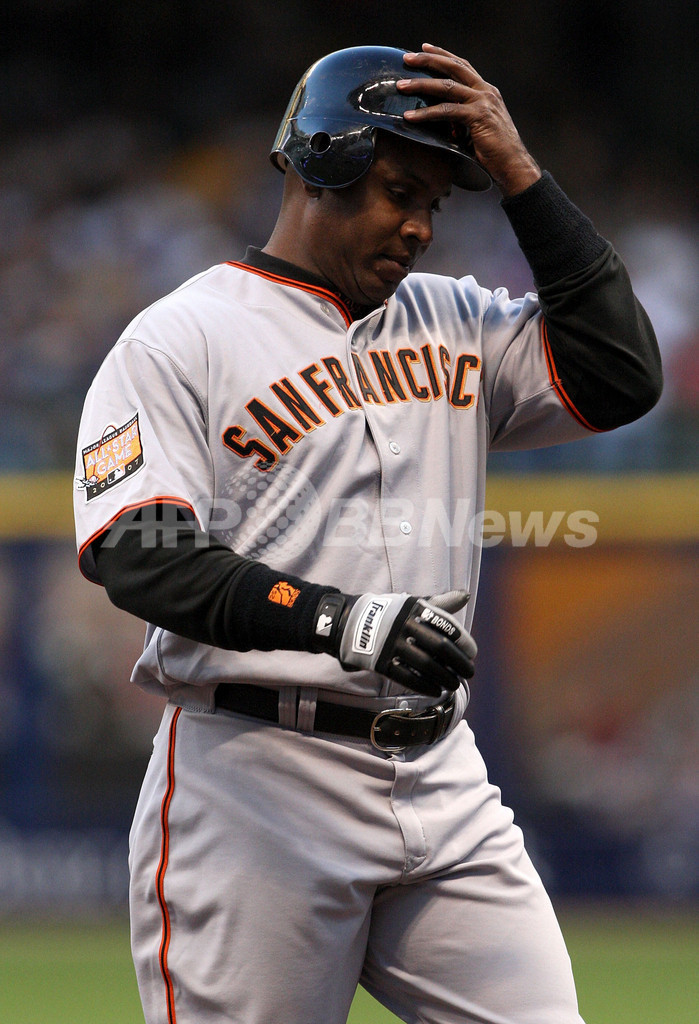 【7月21日 AFP】07MLB、ミルウォーキー・ブルワーズ(Milwaukee Brewers)vsサンフランシスコ・ジャイアンツ(San Francisco Giants)。歴代最多本塁打記録755本まで残り2本に迫っているジャイアンツのバリー・ボンズ(Barry Bonds)は、4番・左翼で先発出場するも4打数無安打に終わり、記録達成は次戦以降へ持ち越された。試合はジャイアンツが8-4で勝利を収めた。(c)AFP/Getty Images