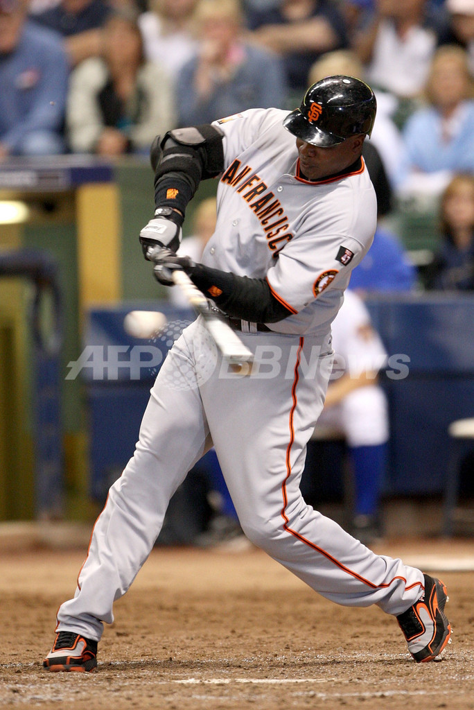 【7月21日 AFP】07MLB、ミルウォーキー・ブルワーズ(Milwaukee Brewers)vsサンフランシスコ・ジャイアンツ(San Francisco Giants)。歴代最多本塁打記録755本まで残り2本に迫っているジャイアンツのバリー・ボンズ(Barry Bonds)は、4番・左翼で先発出場するも4打数無安打に終わり、記録達成は次戦以降へ持ち越された。試合はジャイアンツが8-4で勝利を収めた。(c)AFP/Getty Images