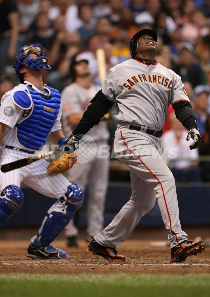 【7月21日 AFP】07MLB、ミルウォーキー・ブルワーズ(Milwaukee Brewers)vsサンフランシスコ・ジャイアンツ(San Francisco Giants)。歴代最多本塁打記録755本まで残り2本に迫っているジャイアンツのバリー・ボンズ(Barry Bonds)は、4番・左翼で先発出場するも4打数無安打に終わり、記録達成は次戦以降へ持ち越された。試合はジャイアンツが8-4で勝利を収めた。(c)AFP/Getty Images