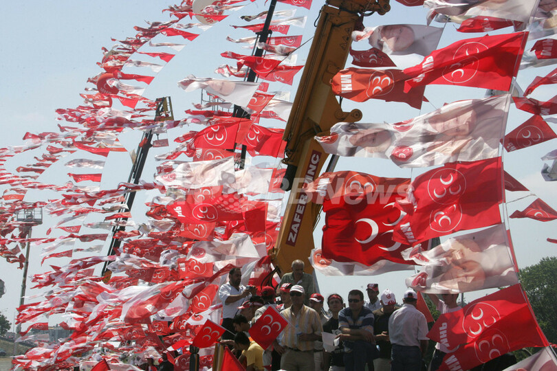 ニュース 政治・経済 トルコ総選挙、いよいよ投票へ 2007年7月22日 7:51 発信地:イスタンブール/トルコ [ 中東・北アフリカ トルコ ] このニュースをシェア ‹ › ❮ 3/5 ❯ 2007年7月21日、イスタンブール(Istanbul)で行われた民族主義者行動党(MHP)の集会で党旗を掲げる支持者。(c)AFP/HOCINE ZAOURAR 画像作成中 ! 【7月22日 AFP】トルコ議会の総選挙を22日に控えた21日、各党のリーダーはそれぞれの選挙活動を締めくくった。当初11月に予定されていた総選挙が前倒しされ繰上げとなった今回の投票では、レジェプ・タイップ・エルドアン(Recep Tayyip Erdogan)首相率いる与党に野党が挑戦する形となっている。(c)AFP 政治・経済 一覧へ> メディア・報道関係・法人の方向け 写真・動画 購入のお問合せ>