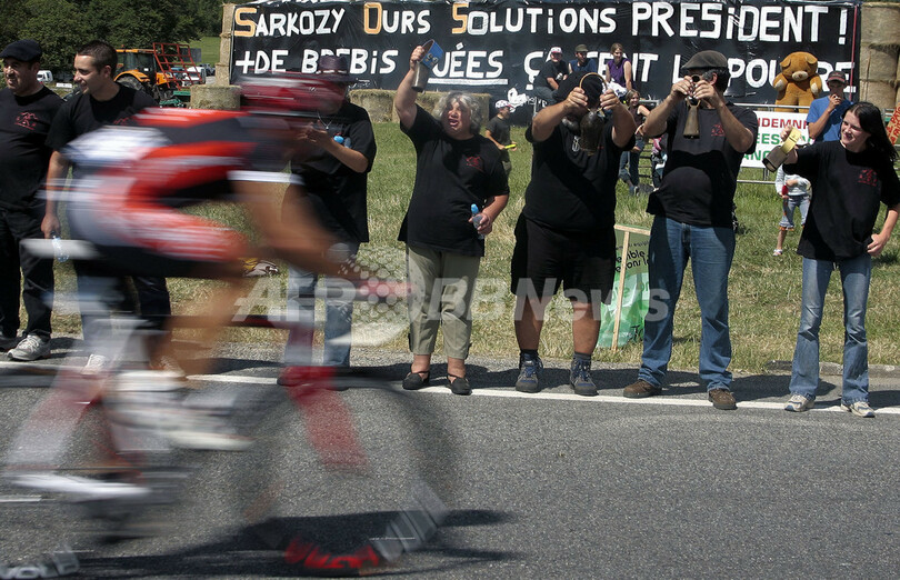【7月24日 AFP】自転車競技2007ツール・ド・フランス(2007 Tour de France)の第15ステージ(フォワからルダンビエイユ・ルルーロン)の通過地点にあたるTarascon-sur-Ariegeで、ピレネー(Pyrenees)山脈にクマを放つ政策に反対する団体が、参加選手の通過に合わせ横断幕を掲げ、抗議行動を展開した。