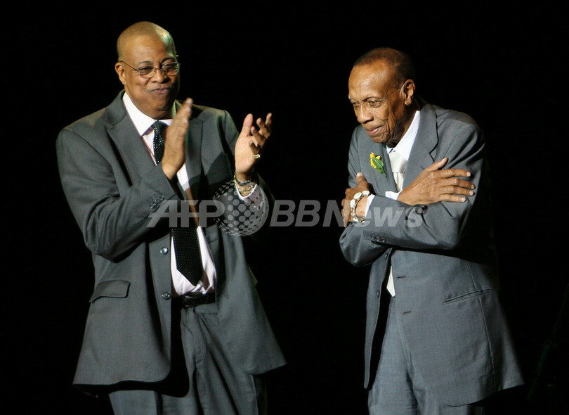 2007年7月26日、マドリード(Madrid)で開催したコンサートで、父親で伝説のピアニスト、ベボ・バルデス(%%Bebo Valdes%%)と共演するヘスス・チューチョ・ヴァルデス(Jesus Chucho Valdes、左)。(c)AFP/PIERRE-PHILIPPE MARCOU