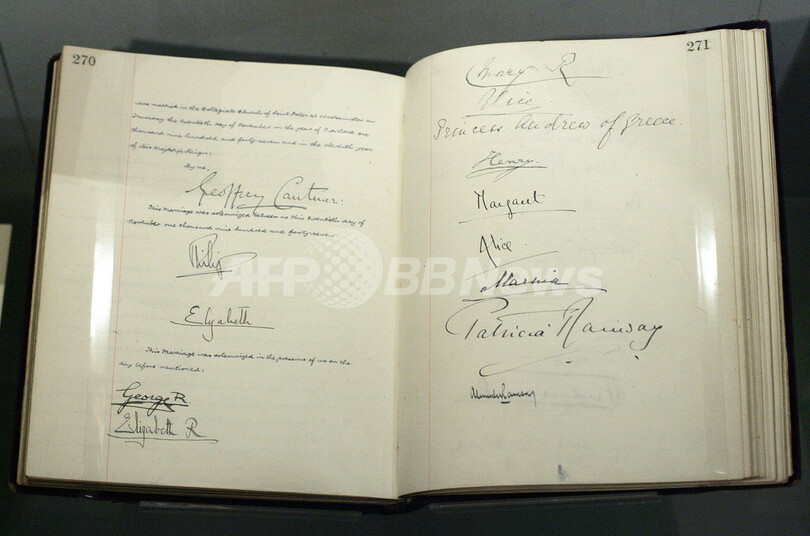 ニュース ライフ 女王結婚60周年を記念する展覧会 2007年7月29日 17:41 発信地:ロンドン/英国 [ ヨーロッパ 英国 ] このニュースをシェア ‹ › ❮ 6/6 ❯ 2007年7月28日、ロンドンのバッキンガム宮殿に展示されるエリザベス女王の結婚式で立会人の署名が書かれたエリザベス女王とフィリップ殿下の結婚証明書。(c)AFP/SHAUN CURRY 画像作成中 ! 【7月29日 AFP】エリザベス2世(Elizabeth II)の結婚60周年を記念して28日、バッキンガム宮殿では特別展覧会が一般向けに公開された。宮殿では1947年11月20日当時の映像や衣装が展示され、女王の結婚式を再現している。(c)AFP/SHAUN CURRY ライフ 一覧へ> メディア・報道関係・法人の方向け 写真・動画 購入のお問合せ>