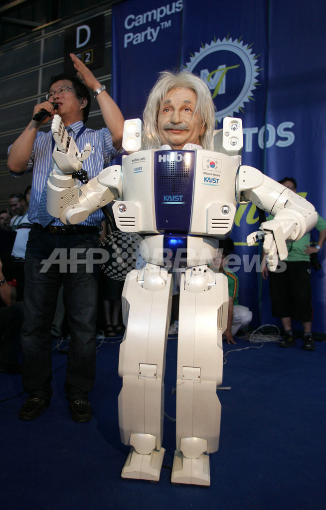 実はこれは韓国科学技術院(KAIST)の呉俊鎬(オ・ジュンホ、Jun Ho Oh)教授が発明したアインシュタインにそっくりな人間型ロボット「ヒューボ(Hubo)」。身長1メートル37センチで、「頭脳」に組み込まれたWindows XPにより、思い通りの動作が可能となったという。