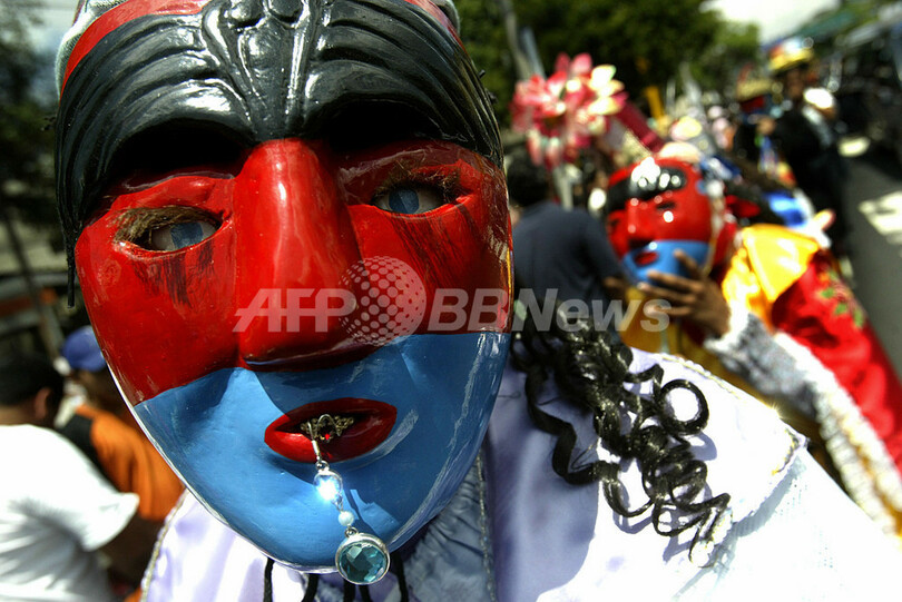 2007年8月1日、エルサルバドルの首都サンサルバドル(%%San Salvador%%)で、世界救世主の日(%%Savior of the World%%)を祝うパレードに参加した伝統舞踊団のメンバー。(c)AFP/Jose Cabezas