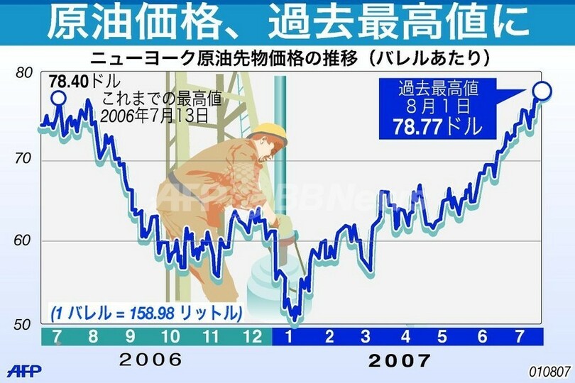 ニュース 政治・経済 図解 ニューヨーク原油先物、過去最高値に 2007年8月2日 19:48 発信地:ニューヨーク/米国 [ 北米 米国 ] このニュースをシェア ニューヨーク原油先物価格の推移を示した図。(c)AFP 【8月2日 AFP】ニューヨーク原油先物価格は1日、1バレル78ドル77セント(約9353円)を達し、過去最高地を記録した。(c)AFP<ニュース解説画像一覧へ> 政治・経済 一覧へ> メディア・報道関係・法人の方向け 写真・動画 購入のお問合せ>