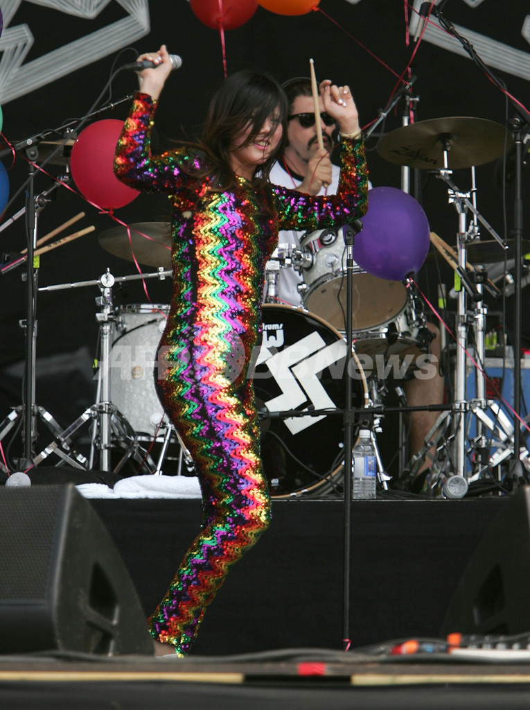 【8月6日 AFP】ボルチモア(Baltimore)のピムリコ競馬場(Pimlico Race Course)で2日間開催される、携帯電話事業社ヴァージン・モバイル(Virgin Mobile)主催の音楽フェス「ヴァージン・フェスティバル2007(Virgin Festival 2007)」の2日目を迎えた5日、CSSことカンセイ・ジ・セール・セクシー(Cansei de Ser Sexy)が登場した。(c)AFP/Getty Images