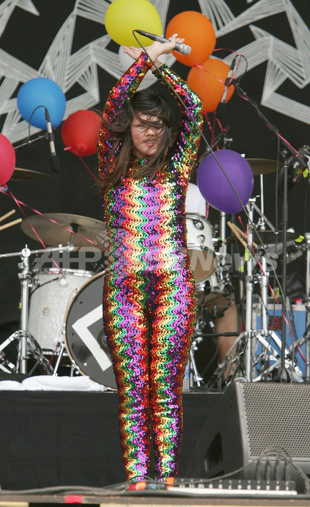 【8月6日 AFP】ボルチモア(Baltimore)のピムリコ競馬場(Pimlico Race Course)で2日間開催される、携帯電話事業社ヴァージン・モバイル(Virgin Mobile)主催の音楽フェス「ヴァージン・フェスティバル2007(Virgin Festival 2007)」の2日目を迎えた5日、CSSことカンセイ・ジ・セール・セクシー(Cansei de Ser Sexy)が登場した。(c)AFP/Getty Images