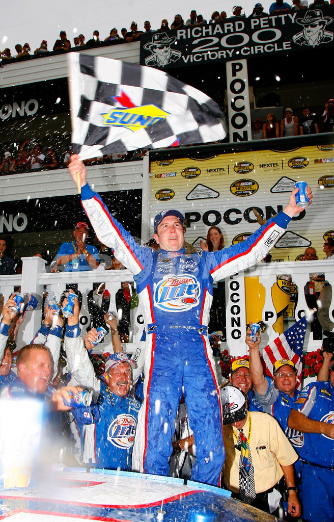 【8月6日 AFP】NASCAR・ネクステルカップ・シリーズ(NASCAR Nextel Cup Series)・第21戦、ペンシルベニア500(Pennsylvania 500)、決勝。2番グリッドからスタートしたペンスキー・レーシング・サウス(Penske Racing South)のカート・ブッシュ(Kurt Busch)は、シーズン初優勝を果たし195ポイント(200周)を獲得した。(c)AFP/Getty Images