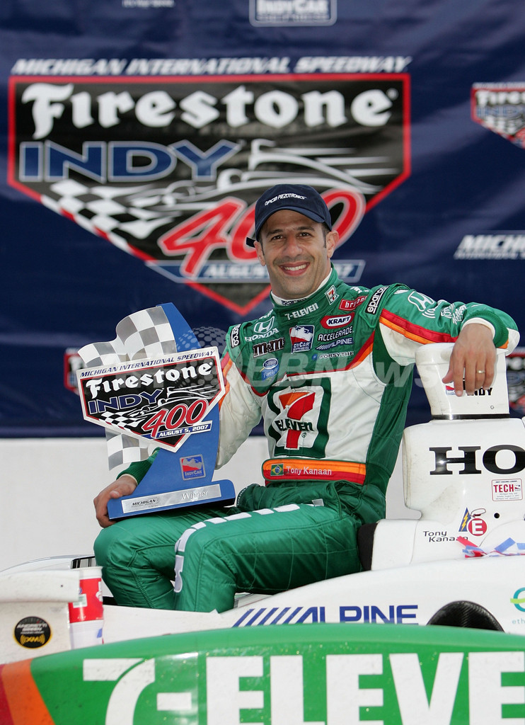 【8月6日 AFP】IRLインディカー・第13戦、ファイアストン・インディ400(Firestone Indy 400)、決勝。8番グリッドからスタートしたアンドレッティ・グリーン・レーシング(Andretti Green Racing)のトニー・カナーン(Tony Kanaan)は、優勝を果たし50ポイント(200周)を獲得した。雨で荒れたレースの最終ラップでカナーンは、チームメイトのマルコ・アンドレッティ(Marco Andretti)との劇的な争いを制し、シーズン3勝目を挙げた。(c)AFP/Getty Images
