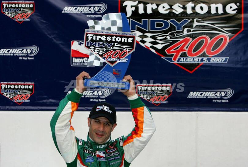 【8月6日 AFP】IRLインディカー・第13戦、ファイアストン・インディ400(Firestone Indy 400)、決勝。8番グリッドからスタートしたアンドレッティ・グリーン・レーシング(Andretti Green Racing)のトニー・カナーン(Tony Kanaan)は、優勝を果たし50ポイント(200周)を獲得した。雨で荒れたレースの最終ラップでカナーンは、チームメイトのマルコ・アンドレッティ(Marco Andretti)との劇的な争いを制し、シーズン3勝目を挙げた。(c)AFP/Getty Images
