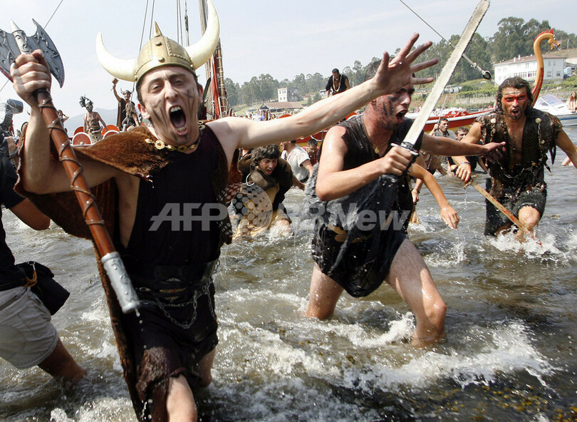 【8月7日 AFP】スペイン北西部ガリシア(Galicia)州ポンテベドラ(Pontevedra)県のカトイラ(Catoira)で6日、毎年恒例の「バイキングの巡礼祭(Romeria Vikinga)」が行われた。