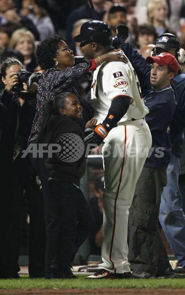 ボンズは子供たち、母親、夫人、チームメイトらと抱擁を交わし喜びを分かち合った後、声援を送ってくれる観衆に対しお辞儀や投げキッスで感謝の気持ちを表した。そしてボンズの名付け親で歴代4位となる660本の記録を持つウイリー・メイズ(Willie Mays)氏が、祝福のために姿を表した。