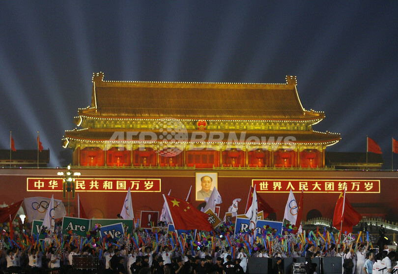 【8月8日 AFP】北京五輪開幕まであと1年となった8日現地時間午後8時、北京(Beijing)の天安門広場(Tiananmen Square)で花火が上がり、カウントダウン式典が始まった。